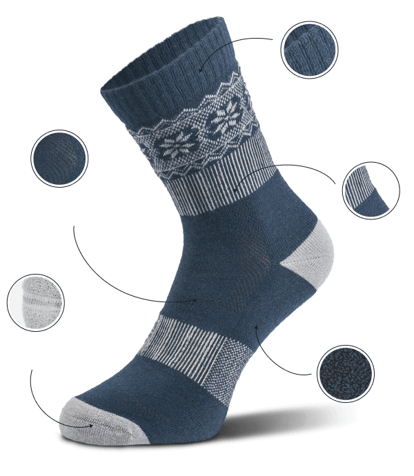 Each sock has a unique decorative band adorned with Nordic patterns circling the ankle.The cold shades of black blueberry and steely blue turn the print up a notch. They look great in boots, running shoes, and even dress shoes.